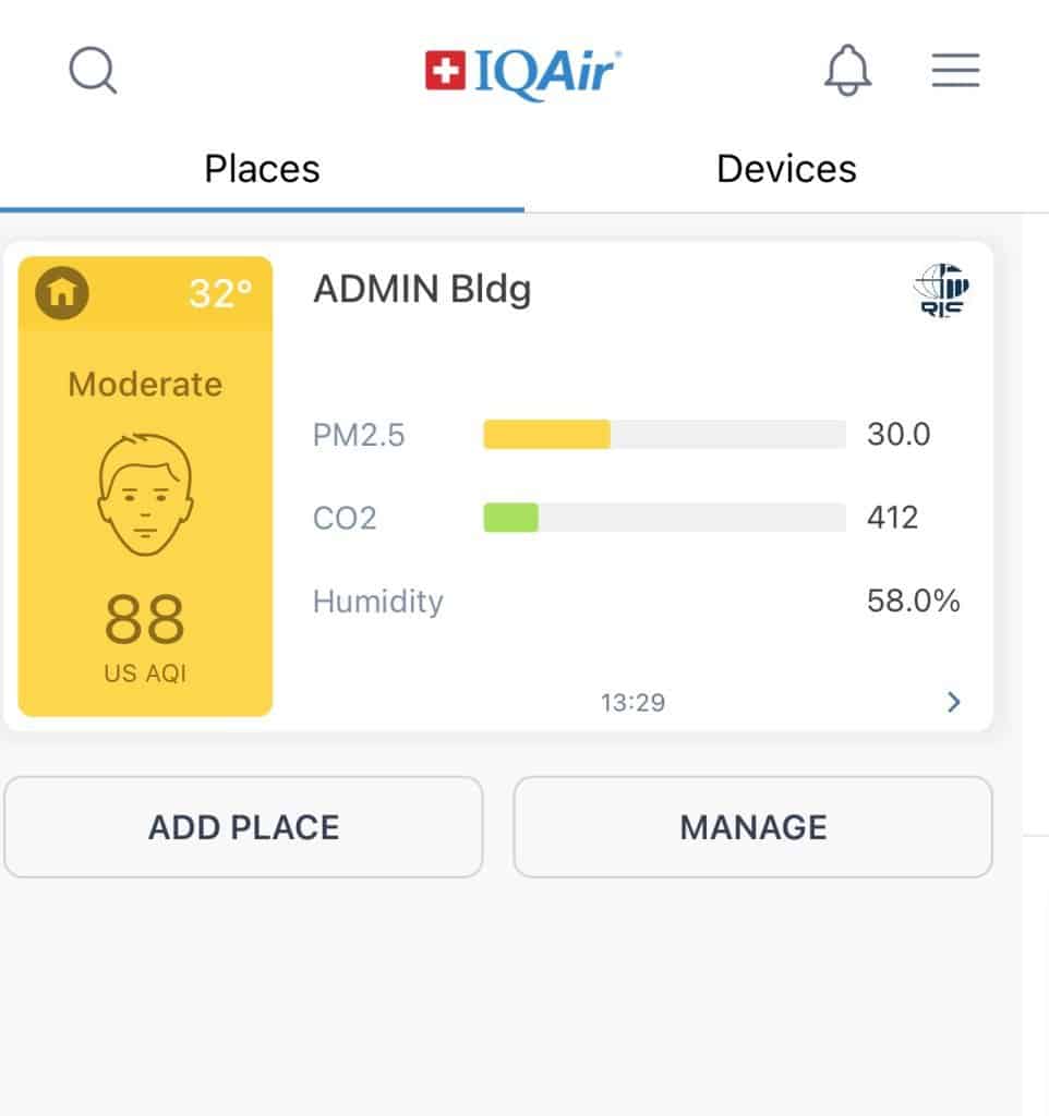 Access our school’s primary AQI sensor through the AirVisual app. Download it for free from the Apple Store or Google Play.